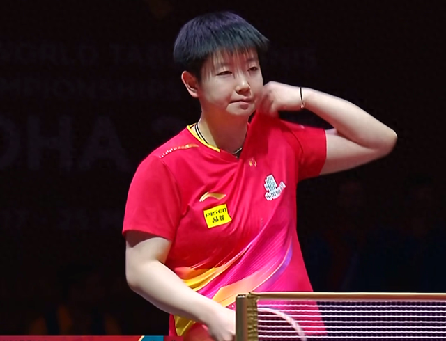 那么赛前有没有人帮孙颖莎做好备战呢?主教练邱贻可在比赛过程当中曾经批评过她,说她在比赛里的专注度不足,而且老是想着和对手较劲,打得很不舒服。但是没有提到战术方面的原因,可赛前孙颖莎的一个动作也能够体现出,她其实并不了解这个对手。