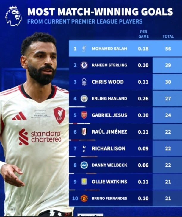 直播吧10月18日讯德国转会市场盘点了现役英超球员打进制胜球排行情况,萨拉赫以56球遥遥领先,斯特林以39球位居次席。