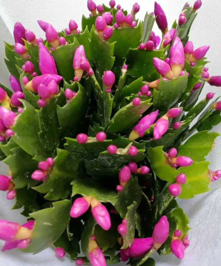 蟹爪兰它的花朵像蟹爪一样,小花生于顶尖花序,颜色五颜六色,朵朵盛开,多姿多彩,小巧玲珑,美丽可爱,婀娜妩媚,娇艳欲滴,楚楚动人。它的花期在秋冬天繁花似锦,花开又漂亮,让人移不开眼,太美了。