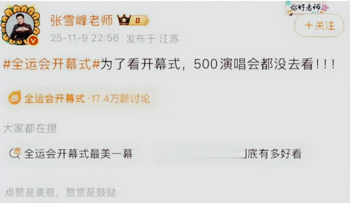 更让事件变得扑朔迷离的是,有网友扒出,就在演唱会的前一天,张雪峰还曾在微博上发文称:“为了看(全运会)开幕式,500演唱会都没去看!” 这番言论与他次日现身演唱会的行为形成了直接矛盾。